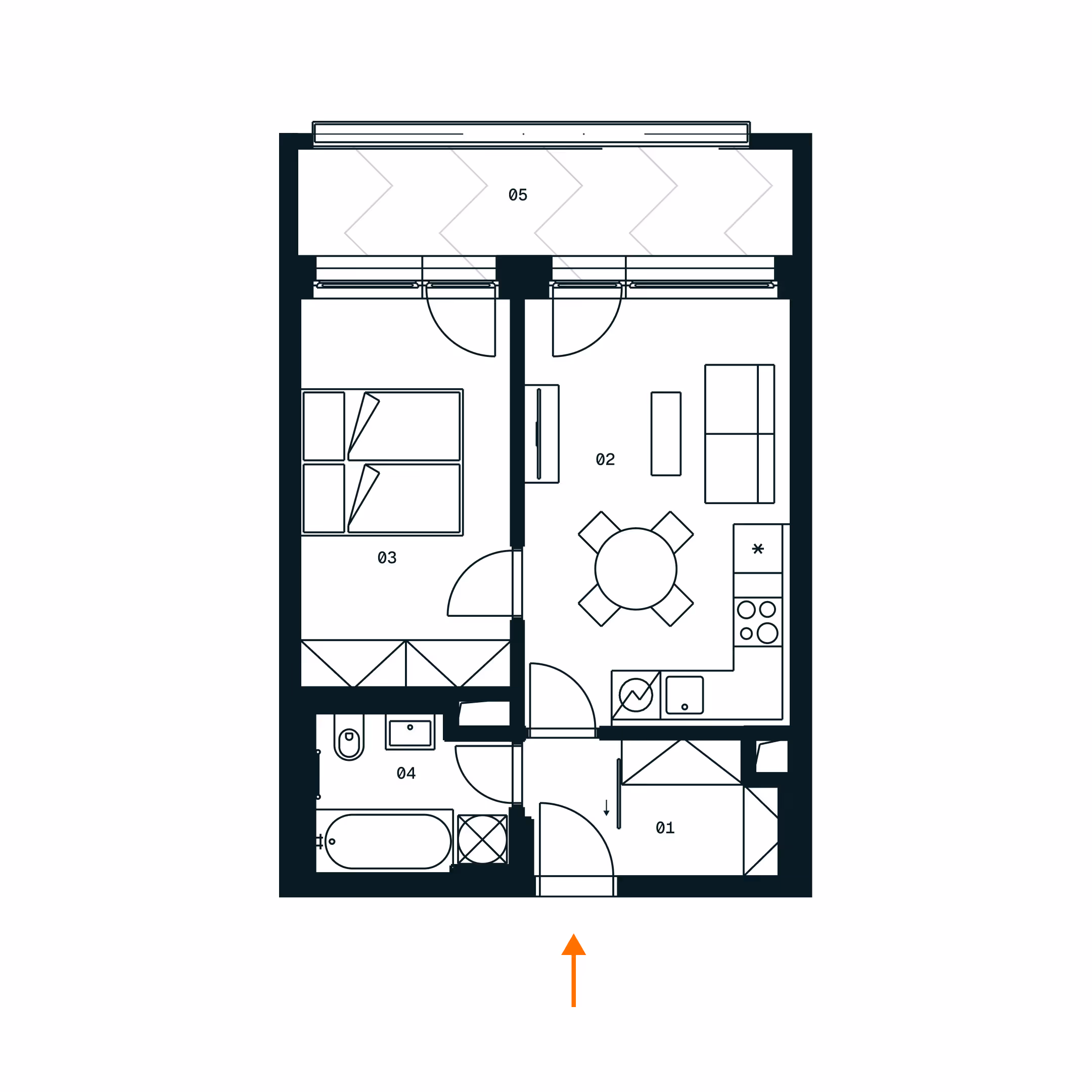 Plochy místností jsou orientační. Zařízení v půdorysu (nábytek, kuchyň, spotřebiče) není součástí dodávky. Specifikace dodávky a vybavení jsou ve standardním provedení, které je přílohou Smlouvy. Vizualizace jsou ilustrativní. Developer si vyhrazuje právo na změny.