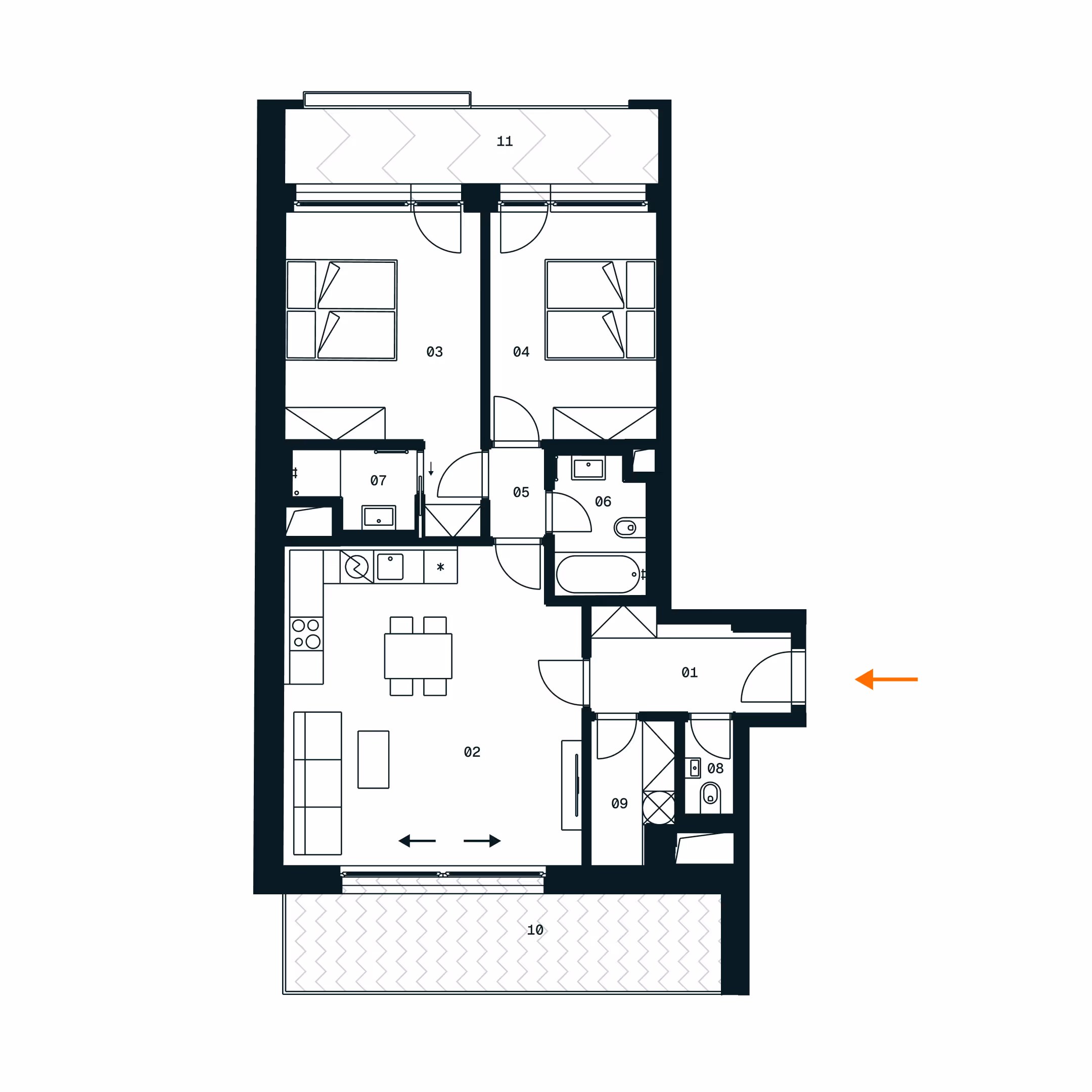 Plochy místností jsou orientační. Zařízení v půdorysu (nábytek, kuchyň, spotřebiče) není součástí dodávky. Specifikace dodávky a vybavení jsou ve standardním provedení, které je přílohou Smlouvy. Vizualizace jsou ilustrativní. Developer si vyhrazuje právo na změny.