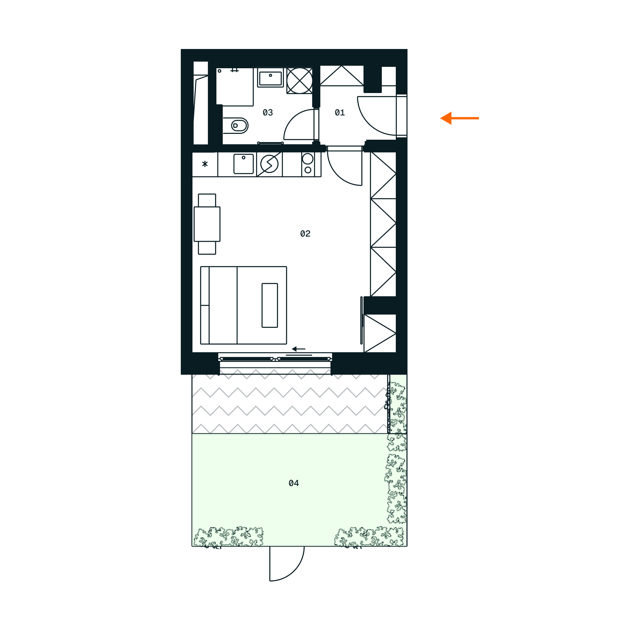 Plochy místností jsou orientační. Zařízení v půdorysu (nábytek, kuchyň, spotřebiče) není součástí dodávky. Specifikace dodávky a vybavení jsou ve standardním provedení, které je přílohou Smlouvy. Vizualizace jsou ilustrativní. Developer si vyhrazuje právo na změny.