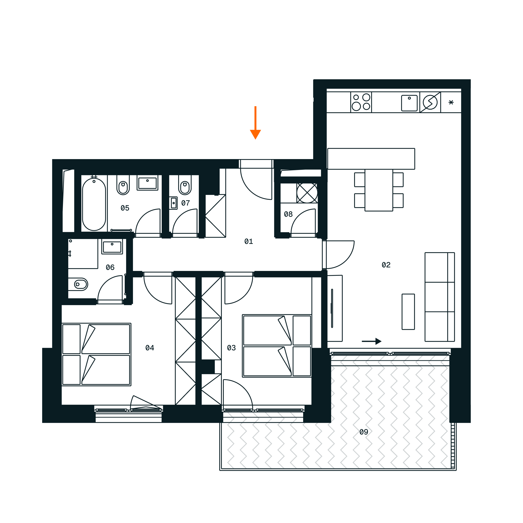 Plochy místností jsou orientační. Zařízení v půdorysu (nábytek, kuchyň, spotřebiče) není součástí dodávky. Specifikace dodávky a vybavení jsou ve standardním provedení, které je přílohou Smlouvy. Vizualizace jsou ilustrativní. Developer si vyhrazuje právo na změny.