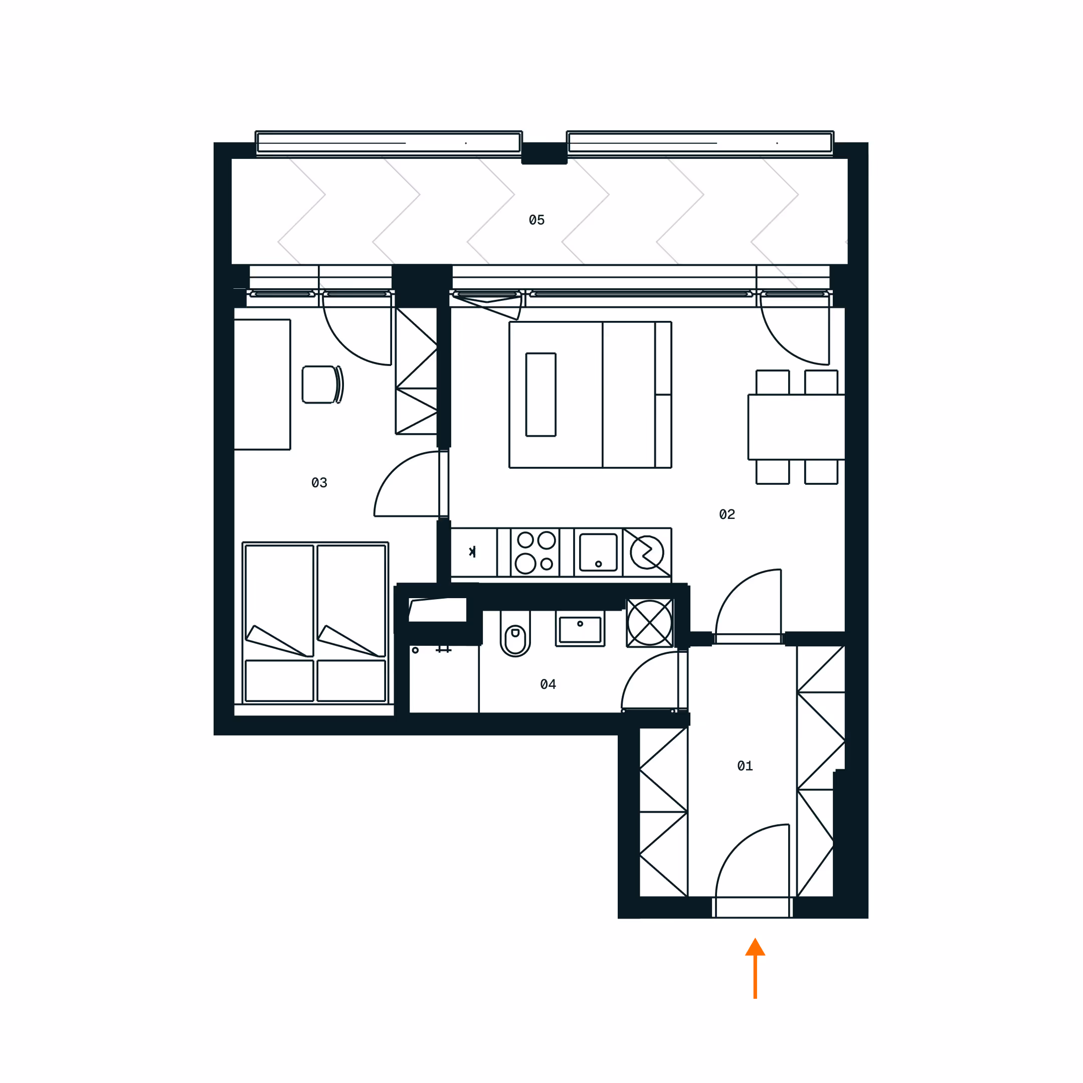Plochy místností jsou orientační. Zařízení v půdorysu (nábytek, kuchyň, spotřebiče) není součástí dodávky. Specifikace dodávky a vybavení jsou ve standardním provedení, které je přílohou Smlouvy. Vizualizace jsou ilustrativní. Developer si vyhrazuje právo na změny.